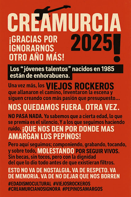 NO SERÁN TAN JOVENCITOS SI HAN NACIDO EN EL 85 CREAMURCIA 2025¡Gracias por ignorarnos otro año más!  CREAMURCIA 2025¡Gracias por ignorarnos otro año más!  Los “jóvenes talentos” nacidos en 1985 están de enhorabuena.Una vez más, los viejos rockeros que allanaron el camino, inventaron la escena y siguen creando con más pasión que presupuesto…nos quedamos fuera. … Leer más